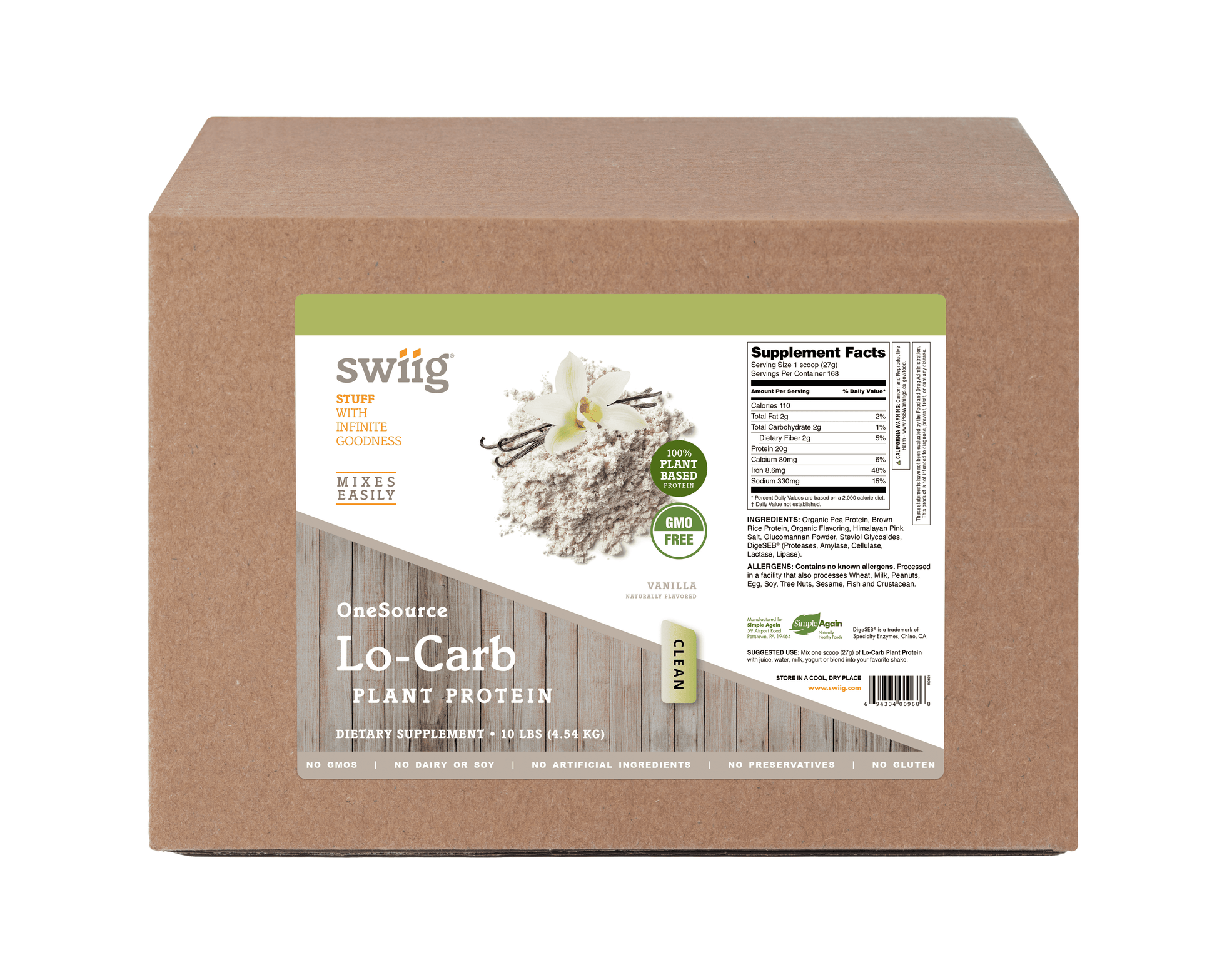 Organic Pea Protein, Brown Rice Protein, Organic Flavoring, Himalayan Pink Salt, Glucomannan Powder, Steviol Glycosides, DigeSEB® (Proteases, Amylase, Cellulase, Lactase, Lipase).